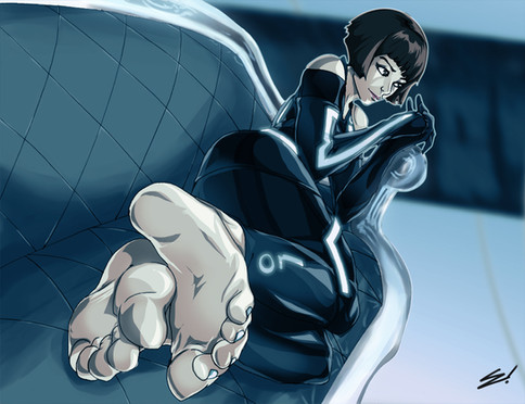 Oh, no, a missed opportunity! Β I was expecting her feet to be all cybered out too...skin chips, glowy circuitry patterns and whatnot. Β Surely that would be useful for a playful, multitasking hacker somehow. Β