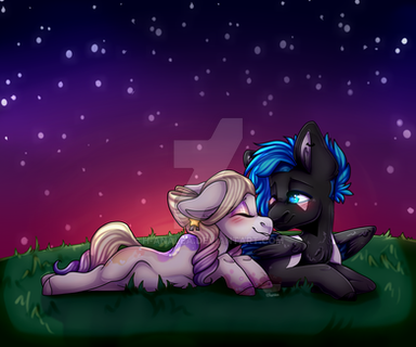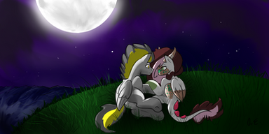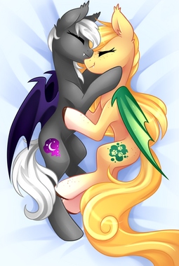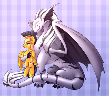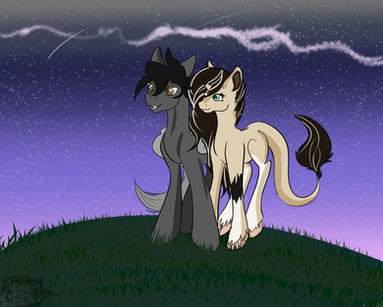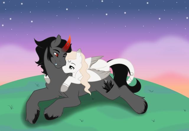 Wow, Blade Dancer and Xenilla look adorable in this pic. Β Really like how much of a tsundere Xen is acting by trying to be stoic while Blade is being her usual self. Β The little pregnant belly on the mare makes the moment sweeter.