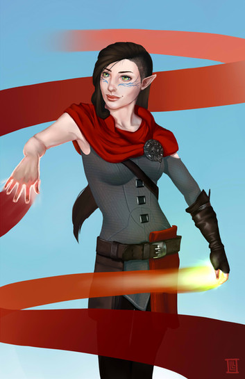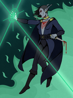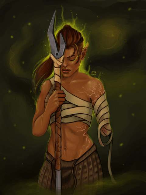 Great work! It's always nice to see Merrill in more of an action-oriented context, as a reminder she's not just a cute little cinnamon roll, and you pulled it off well here. Really like her determined stare and pose, and you did a good job with the lighting and blood effects too. Well done!