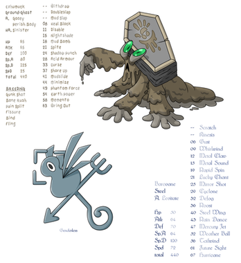 The interesting thing about this one is that I would imagine it being quite offensively inclined, unlike its previous evolutions. The problem him is, as a 3rd stage Pokemon, it would allow Dusknoir to use an evolite, rendering Dusclops useless. His attack is a bit OP as well, perhaps making it unable to be PP boosted, or not making it an OHKO (maybe taking away 75% of the current health?) would be more reasonable. I must say though, out of the Create a Legend contest entries, this one is one of if not my favorite. Very nice work!