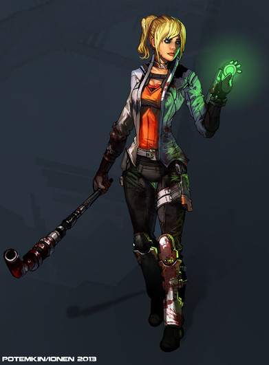 i love the creativity in this with the hair and drink and how you chose to show off the detail in the arm.. i also very much enjoy that you chose to go with a futuristic style bullpup as opposed to a traditional rifle.. creativity to the max..
