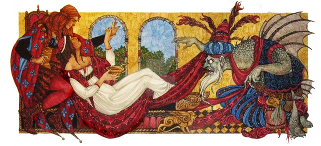 An illustration for "Three Tales of the Parrot" (Italian tale)