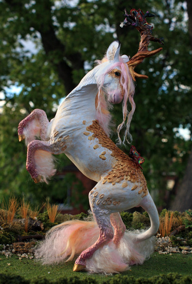 Rendition is a ooak (one of a kind) kirin sculpture. She was made from polymer clay over a wire and foil armature.Rendition was started sometime last June, and I found her in a cupboard and decided to finish her. I haven't done a sculpture that balances off two legs in a long time, so that was fun, and I also tried using enamel paint for the first time on her which worked out well. She was an experiment that actually went nicely, that doesn't happen very often!
