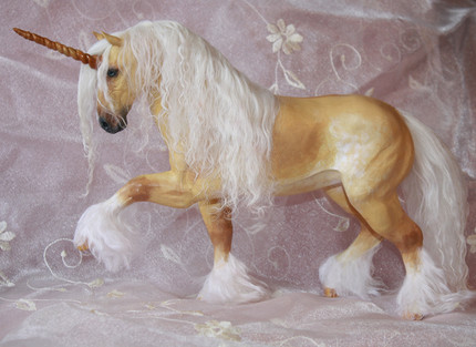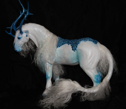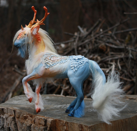 Union is a ooak (one of a kind) kirin sculpture, made from polymer clay over a wire and foil armature. He is about 5 inches long from chest to bum and about 8 inches tall to the top of his antlers. He was painted in acrylics and his hair is tibetan lamb fur.I sculpted Union back in August 2012 when I was in Delaware visiting a good friend of mine, ~3kidsandahorse (same friend who owns Aphelion and Illiad!). We had several little sculpting parties and I intended to finish Union while there and leave him with Megan as a gift. I ended up finishing the sculpting part but didn't have time to paint him, so left him at her place for her to finish. Almost a year later, Megan mentioned she would be coming up my way and I asked her to bring Union so I could finish him off, and here he is! He'll be going back home to Delaware soon however.