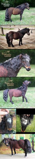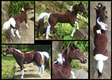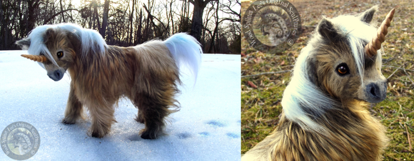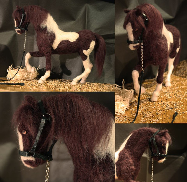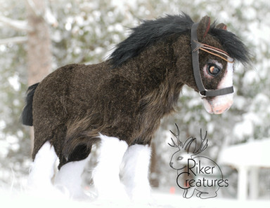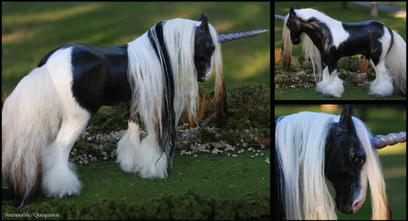 Volition is a ooak (one of a kind) clydesdale unicorn stallion sculpture. He is made from polymer clay over wire and foil, and painted in acrylic. Like all my sculptures, Volition is a true one of a kind, meaning no moulds were used or taken in his creation. He is quite large, about 6 inches long from chest to bum. He has brown inset resin eyes and tibetan lamb fur for hair.Volition is actually a very old sculpture, I started him in 2011 and put him aside for several months, later to realize I had done his anatomy wrong. At one point I removed his old head and attached it to another sculpture (Meridian the hippocampus, if you're curious) and made him a new one. Once again I abandoned him and finally got to working on him again in 2013, but the way his original armature was made I felt he was better suited to a draft body. I got a little carried away with the painting on his white markings but I like how the texture turned out. I haven't painted a bay in a long time, nor have I ever done much in the way of draft horses so this guy was a nice change for me.