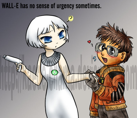 this really makes Wall-E look like a cool, tough guy who just saved his gal...either that or its just me XD sorry. but this drawing really make Eve and Wall-E look soooo good together! even though Wall-E is in pain...poor guy..