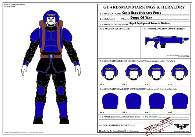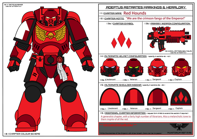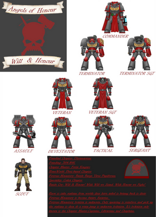 My own personal chapter.The Guard Dogs space marine chapter, is unique among other chapters being one of the most friendly chapter to appear in the grim darkness of the 41st millennia. Even compared to the Salamanders, they are overtly friendly to the average imperial citizen even putting themselves in greater danger to save even the smallest child against some of the most dangerous foes in the imperium. They seem to show up where they are most needed forgoing all glory seeking and instead of focusing on defending the average imperial citizen regardless of occupation or class. Even after the threats to the planet has been eradicated, the Guard Dogs seem to stay for as long as necessary in order to protect the planet only to disappear back into the void to aid another planet in the even greater danger. However these actions have brought them too odds with the Inquisition, at times when the two forces have met each other it is not uncommon for the commander of the chapter to speak in harsh words to the inquisitors on world. Despite this the Guard Dogs are spoken with respect and honor, even their cousin chapters hold them in high regard and are always glad to share combat with them when they arrive.