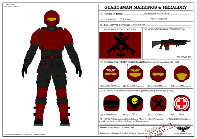 Unlike other chapters, the Guard Dogs unusually field their warriors in ancient armor. Some even dating back to the 30th millennia. In fact the Lord Commander of the entire chapter is know to wear Cataphractii pattern terminator armor which dates back to before the Great Crusade. The chapter is also known to field a wide assortment of vehicles, surprisingly the chapter also holds, among more modern vehicles, ancient battle tanks and aircraft used by the astartes legions such as the Fellblade Super-Heavy tank and Stormbird Gunship which also leads back to the theory that they are a one of the lost legions of Astartes.