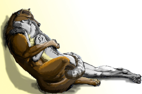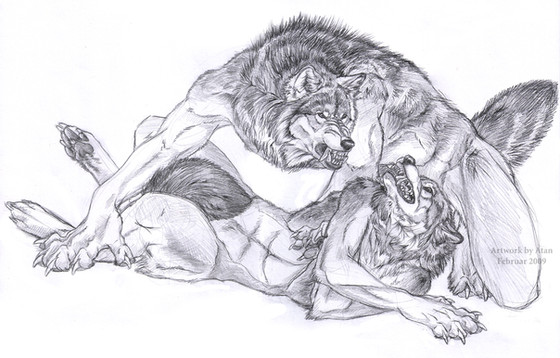 There you see what the heat of the last few days did to my brain. Now I'm drawing hugging werewolves instead of ones that eat people. Was a nice fur practice anyway and I still suck at using colors, meh. I ran the pic through the Photoshop color adjustments but I liked the pale colors I originally painted them with best.That's supposed to be a male and a female. My female werewolves do not have boobs (if she had any, they'd be showing above her arm, I suppose). I think it would be really uncomfortable to run on four legs with two wobbly balls of fat on the front.