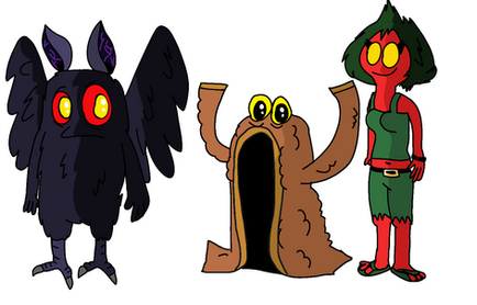 Flatwoods Monster (nicknamed Flats by her fellow cryptids) is an extraterrestrial cryptid. She and a few other members of her species had visited Earth to sightsee, but she was left behind while her comrades left in a rush to avoid detection from the locals. Despite having hyper-intelligence, she has the curiosity of a child when it comes to all the quaint things Earth has to offer. She considers Motherman, Bigfoot, and even Jersey to be her best friends.