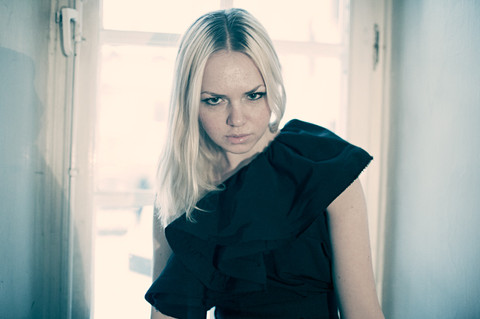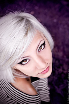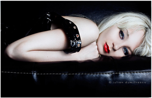 Very striking - bright blonde and deep black against a background muted enough to bring out both. Usually I dislike copious amounts of makeup, but with the expression, it manages to feel more natural. Good composition in the image as well.