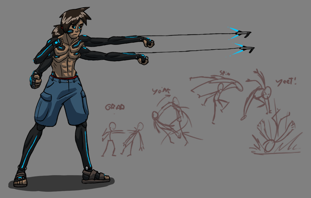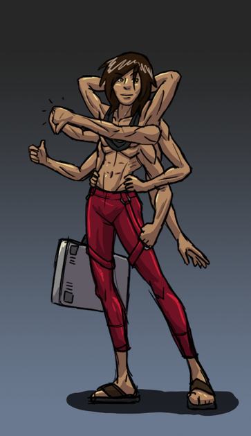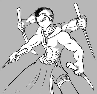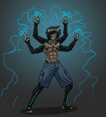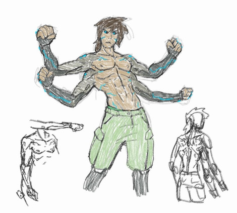 a redesign of an old character i created years ago.his name is Syclone "not really that's what he calls himself now" and he was subject to alien experiments and such for some reason. they're testing did work but had a bad side effect in that he becomes mentally unstable if he does to much with both sets of arms because his mind can't handle the multi tasking needs required by the extra set of arms. he originally had 4 swords, but i decided to switch 2 of those with laser pistols.