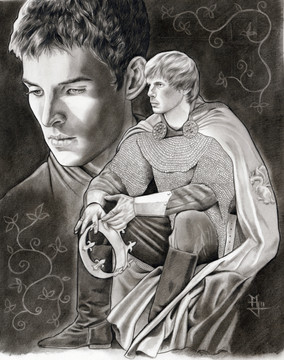 Drawing based on the BBC series Merlinfeaturing portraits of Colin Morgan as Merlin and Bradley James as King Arthur.