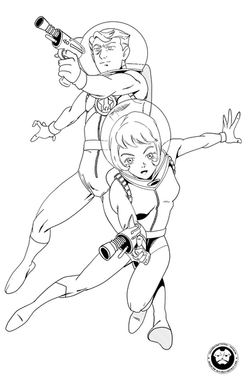 You've captured the era perfectly. Scared green princess, courageous white hero with squinty eyes, fancy ray gun, squinty eyes, and a space helmet to protect everything above the nose!