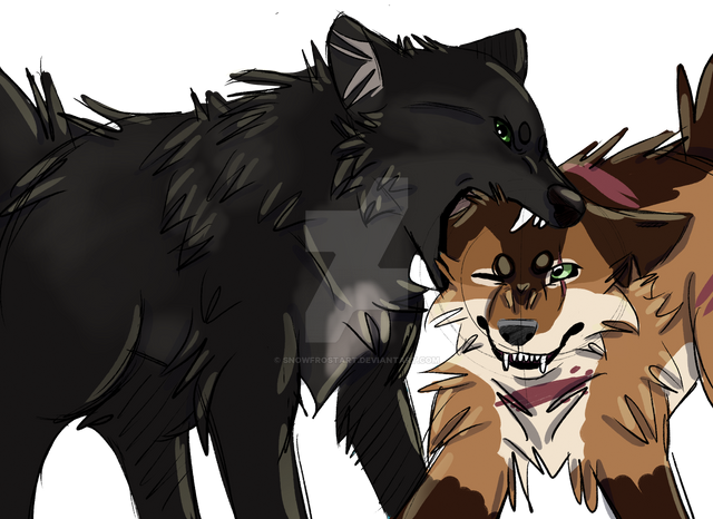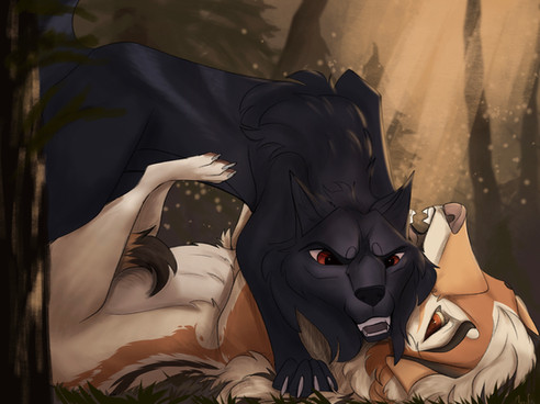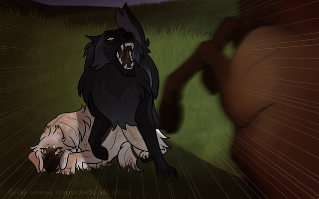 From the rise above and behind her a massive shadow lunged. Red eyes like coals locked intently on their targets, pupils constricted to pinpoints. Aira spun in place. Her eyes widened in horror. Her jaw fell open and she began to leap out of the way - too late.