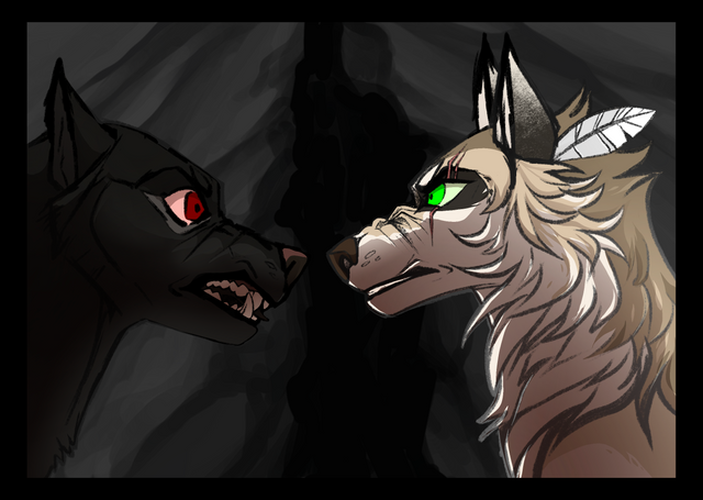 As the black wolf came down in the middle of the clearing with an earth-trembling thump, Aira clutched in his jaws, Ryll felt a flame burst to life in her chest. Her sister’s sides were heaving erratically, her eyes wide and jaws twitching open and shut. The black wolf with red eyes dropped Aira to the ground and placed a paw on her throat, snarling down at her. She recognized him, barely. He was a dios, and one who kept to the outskirts of the pack. He did not mingle much, and now she knew why. His paw pressed hard into Aira’s throat, silencing the rasping gurgle she was making.