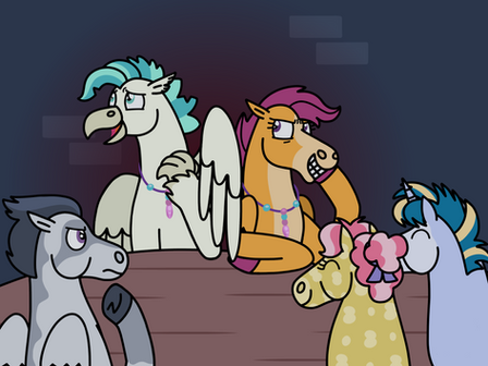 Before Soarin' could respond, a lanky stallion stumbled over to the table, pushing Soarin' out of the seat and taking it for himself.