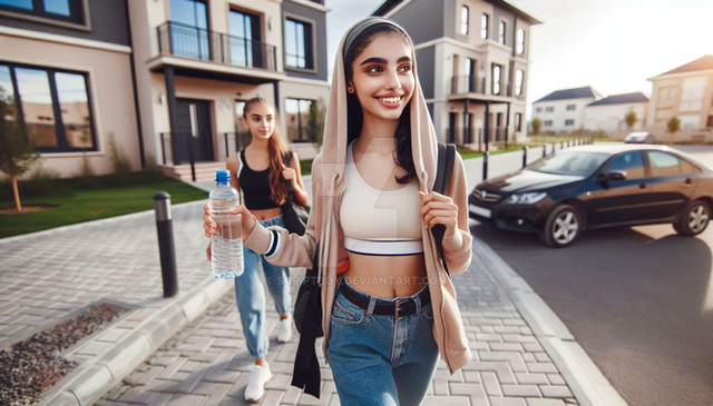 In a series of dynamic snapshots, a young, athletic woman strides confidently towards the gym, her determination mirrored in the firm grip on her water bottle. Each photo captures the essence of a health-focused lifestyle, showcasing the woman's commitment to fitness as she makes her way to a place where she can hone her strength and endurance. The water bottle, a constant companion, symbolizes her dedication to hydration and well-being, completing the image of a person devoted to personal betterment.