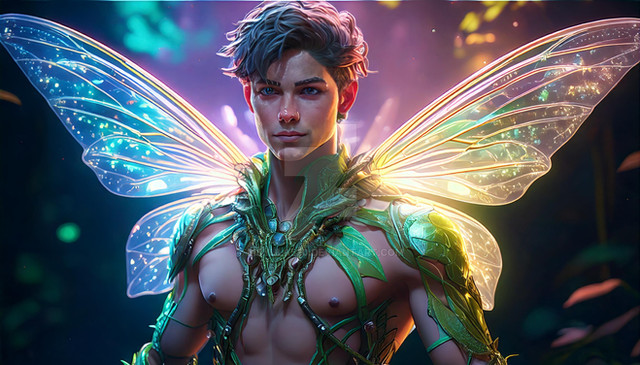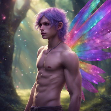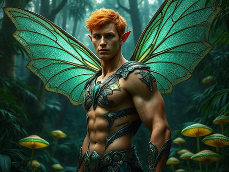 A sprightly muscle fairy with a youthful, athletic build, standing at the cusp of adolescence. His wings shimmer with a vibrant energy, reflecting his boundless enthusiasm for sports and adventure. His attire is a blend of natural elements and sporty gear, embodying his connection to the magical realm and his love for physical activities. His expression is one of determination and playful mischief, capturing the essence of a young fairy who's both strong and full of life.Totally inspired by the stunningly beautiful artwork by DoctorWhoovians2024 , I decided to try to come up with some muscle fairies (or faes) of my own, just for fun. What do you think? Let me know since this is my very first time trying out this prompt!