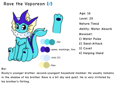 Bio: Vaporeon is a happy, positive force! She loves making others smile and she loves her sisters and friends! Ofc, just cause she's bubbly doesn't mean she isn't fierce, she tends to dominate the battlefield when sparing with others!