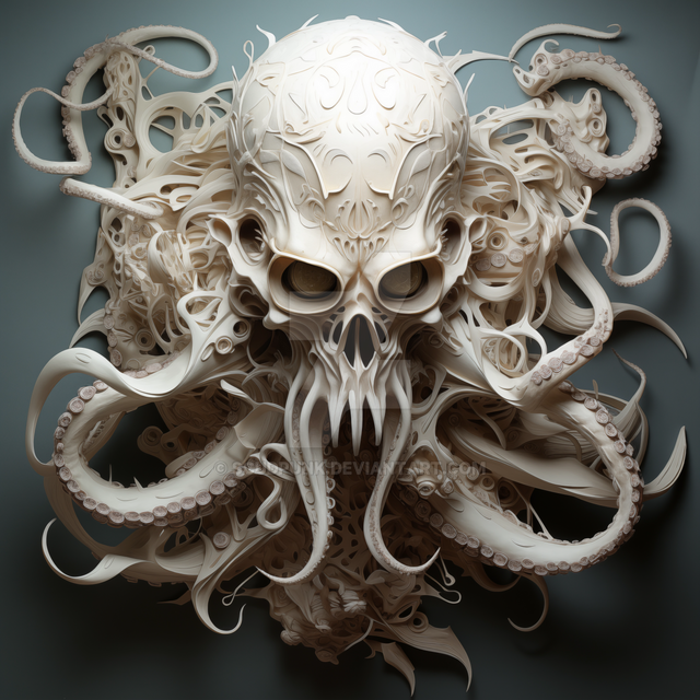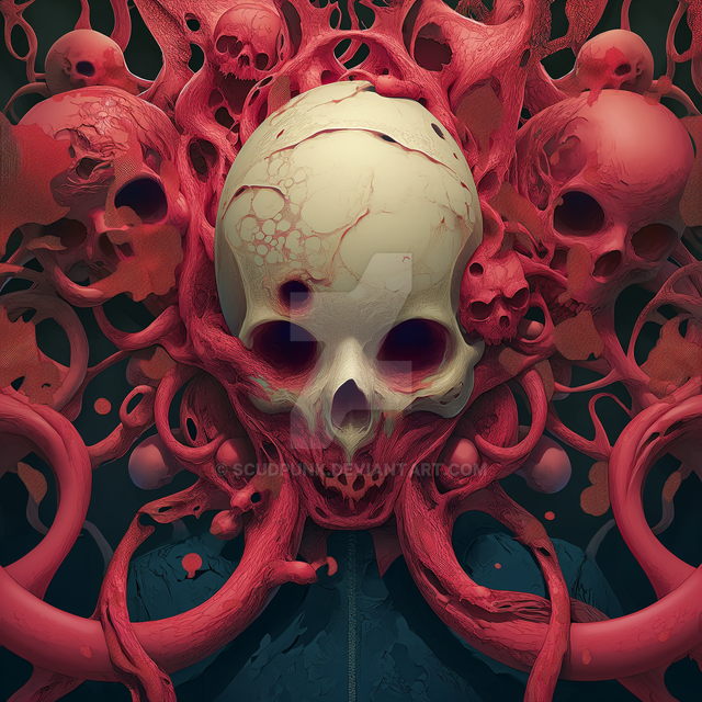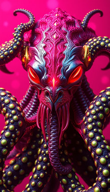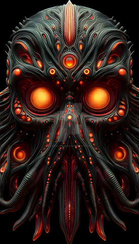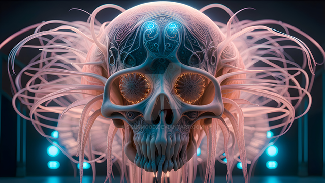 Vectra is a supernatural entity from the DMT realm with a red skull adorned in intricate patterns and vibrant blue eyes takes center stage, surrounded by purple and blue tentacles. The composition creates a captivating yet eerie atmosphere. Dominated by black and red hues, the piece exudes a dark and ominous feel, contrasting with the lively blues and purples of the tentacles. The tentacles, almost hypnotic in their movement, add an intriguing dynamic to the scene. Impressively detailed ai generated art.AI Generated music videoΒ www.youtube.com/watch?v