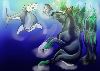 I love the fish's expression and how joyous Leggy is <3 The fish sillouets in the background adds good dimension I like the colors you used for the water and how you showed the current on the water's surface