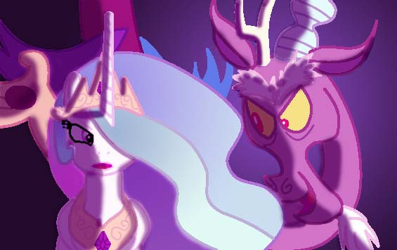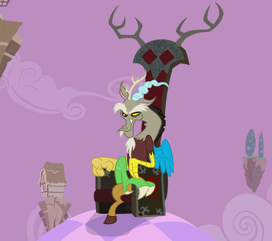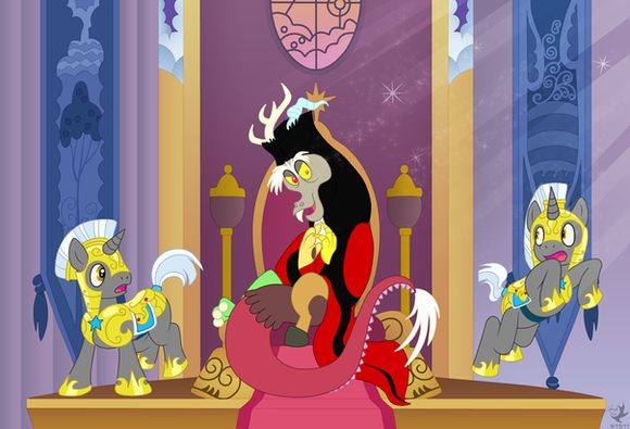 I've actually had this pic in my head for a long while now, so it's great to finally have an excuse to make it a reality. My only regrets is that Discord isn't centered, and that I hadn't allowed myself more room to include other things in the room (like an escort of discorded royal guards, and something to imply that Discord did something to the Elements of Harmony (and their bearers) as well), but such is life. Everything else turned out well enough.