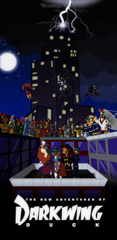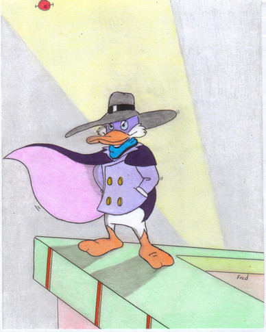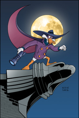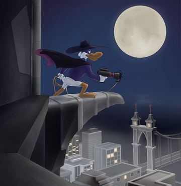 Originally, it started out as just a sketch of Darkwing, using a common pose he was advertised with as a reference. But he turned out so dang good that I figured he deserved a dang good background to go with it. So I drew the tower, then the view of St. Canard referring to actual episode material, inked it, scanned it in to my computer, then started coloring it. And with that, I just started slowly getting more and more detailed, experimenting, and trying new coloring tactics that I hadn't tried before, a lot of which worked out nicely.