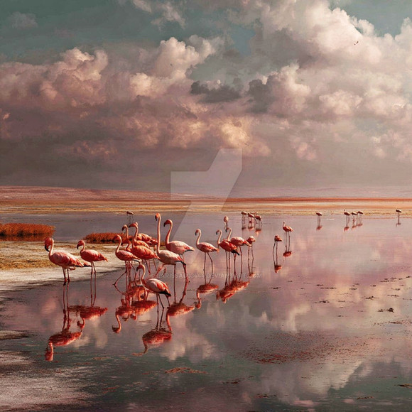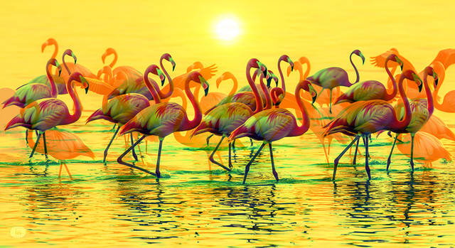 This is a nice one too. The colours are good again and I like the general motive. You already tried to put in some perspective by stacking up the flamingos in front of each other. That's good but I think that you should have put them a little further in the foreground since they appear gigantic in this picture if you compare them with the water. Another part that seems a little illogical is that the water must be quite deep because the people have to go by boat, yet the flamingos can just stand there. A scene with shallow water would have been better cause this way I'm afraid that the flamingos won't stand there for much longer. They'll drown... It's cool that you built in reflections on the water. However, since the water is just a little wavy the reflections of the birds should be distorted by that. And finally I suggest not putting the same image into one manipulation more than once or twice because it most likely will appear unrealistic. The flamingos are just exact copies of each other. That won't happen in real nature.