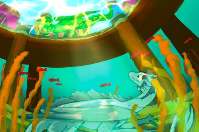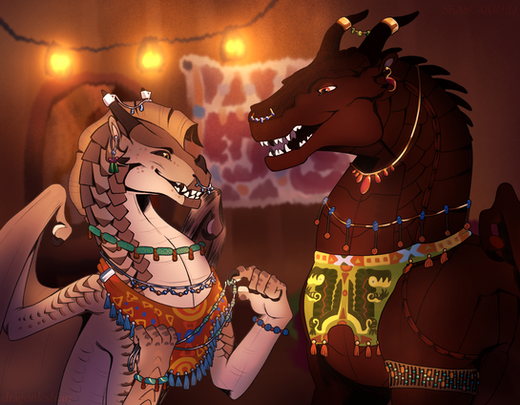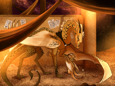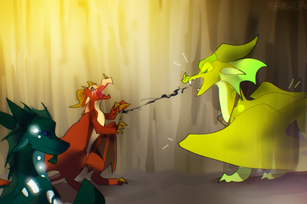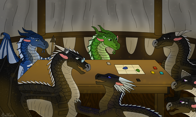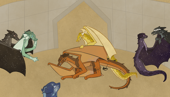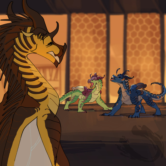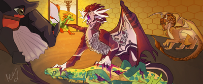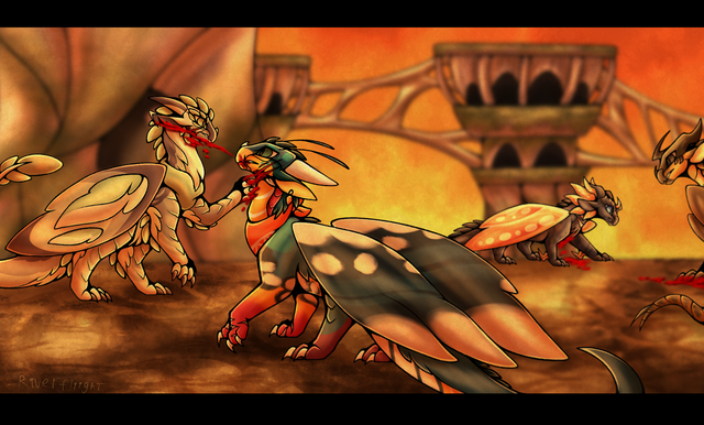 Lacewing ushered the three dragonets to safety, ducking into a maintenance hallway in order to avoid any raiders. Though it meant leaving her trainee, Shisuan, behind to deal with potential raiders, the older dragoness was more than sure that they would be capable of fending off any attackers with the other Alliancers present. She carefully hovered her wings over the terrified dragonets and crooned to them-- soon, safety would be had, and they would be reunited with their parents.She had scarcely stepped past an opening into a neighborhood when another LeafWing, streaked with scarlet patterns, barreled through the opposing entrance. He frantically scanned Lacewing, and equally as frantically, leapt into the air to attack. Quickly, she drew an emerald throwing knife and deftly sent it through his right wing membrane. He collapsed, clutching his injured limb.