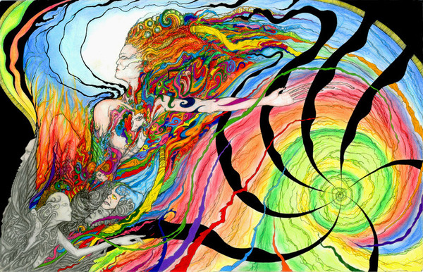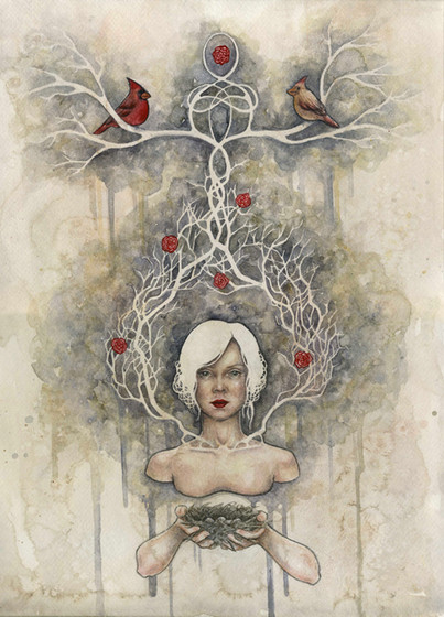 A beautiful piece, and a wonderful sentiment. I can't even figure out what I wanted to say/compliment about this. Parts of this remind me of stained glass windows and the hair reminds me of branches reaching for sunlight, despite still looking like strands of hair. The mixed media element to this just works so well, with all the sections flowing into each other. Great use of passage with the red from the heart. Finally, congrats on the DD!