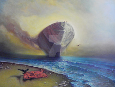 Oil on canvas (170x130 cm)Based on an intense dream where a figure coming towards me. It starts to open up the rags it's wearing. Before me I see this landscape including a sinking boat. For some reason the figure, with two different dimensions, trying to force me into the boat. What happened next is pretty unclear, but I'm sure I can relate to the figures act. Not in a violent way, but the fact of that you're keeping information inside of you. Eventually you have to expose it and release some of it.