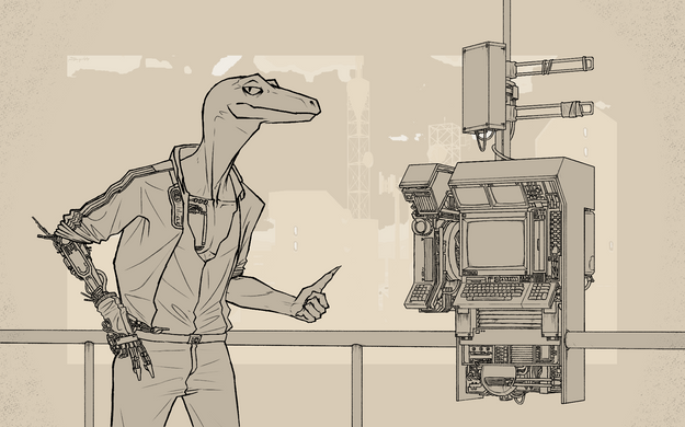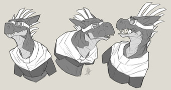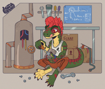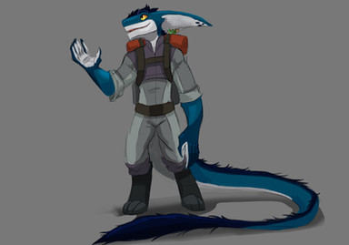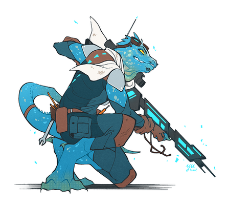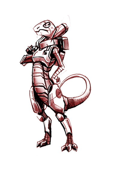 HMM, both submissions with this fella have been quite good, I think it's just that I like how you draw reptiles. I specially like how you gave him shoes (it's a difficult part to add I've found, convincingly at least) and that you utilized the tail to hang extra things. It doesn't have to be prehensile to be of great help!