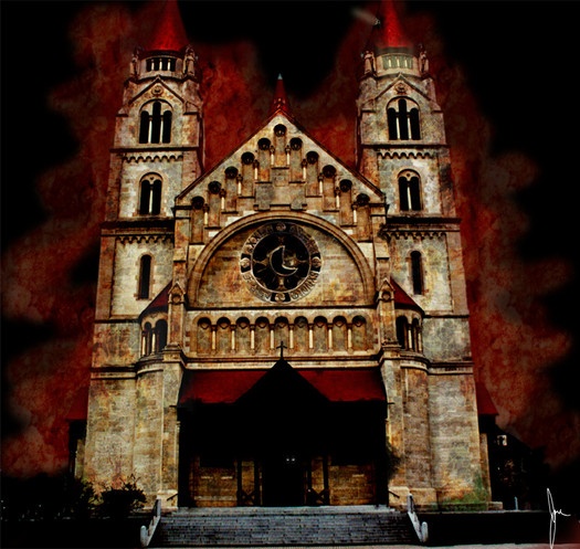 Cathedral photo turned into a nighttime scene. Original photo is mine. Everyting else is created using Photoshop.Both the moon and the bats are brushes by Scully7491 .