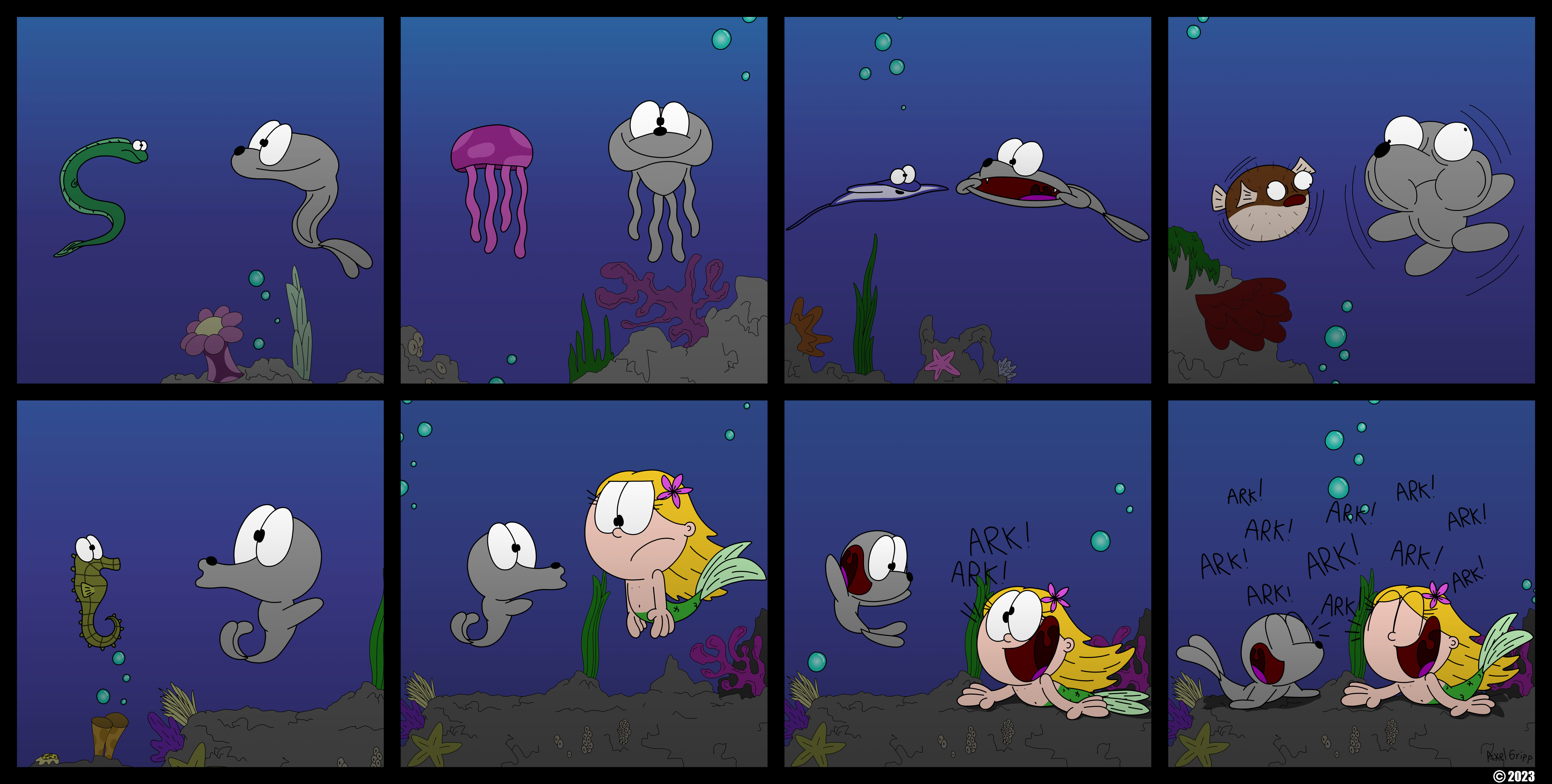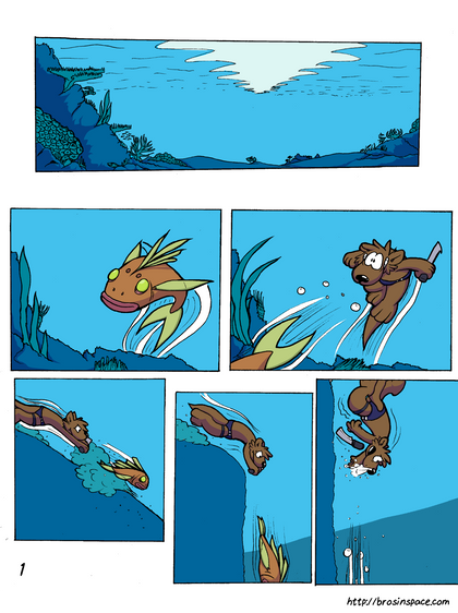 5. Going Swimming: After teaching those cannibals a lesson or two, they're now cooling off in the water (or at least one of them is). It seems like Shelldon is a bit too embarrassed to jump in without anything on. Loa, just thinks Shelldon is afraid of the water. (Embarrassment from lack of clothing isn't a thing in Loa's world. Well, not yet, that is.)