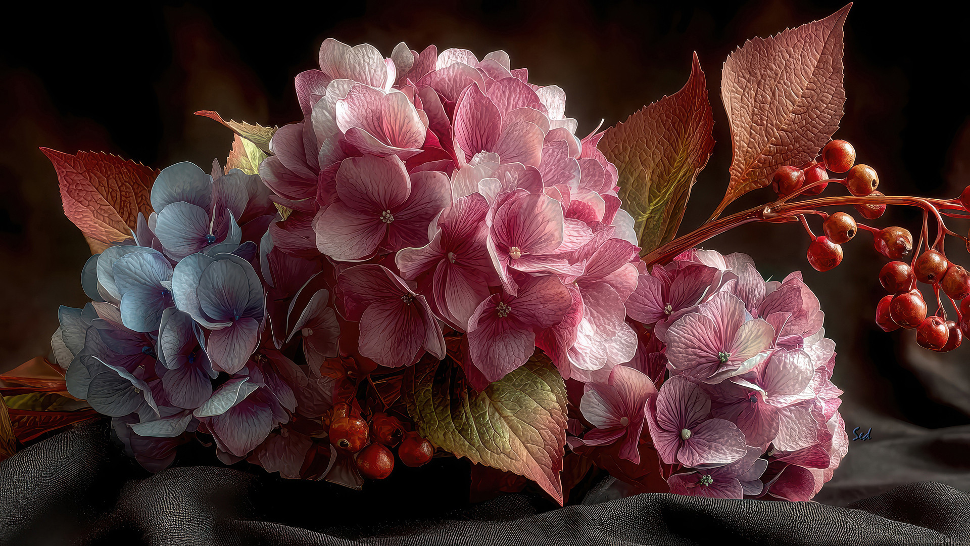 #3d #4k #ai #berries #curves #flowers #leaves #photoshop #pink #sed #topaz #uhd #wacom #wallpaper