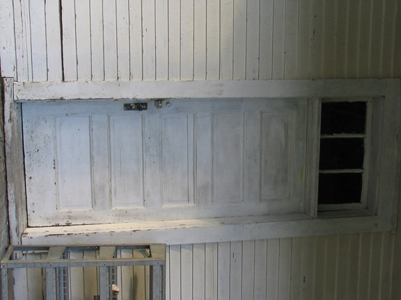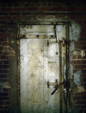The door to a restroom in an abandoned gas station