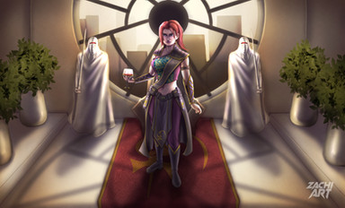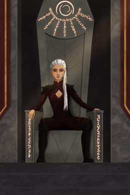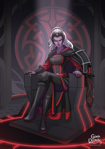What stands out to me is this lady's regal qualities. She's strong and has a quota of pure ruthlessness which she isn't afraid to use. I think the fact she's got a handy sword on her throne--can't consider it a mere command chair--says a lot about her character and species.