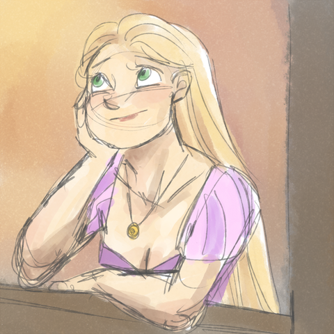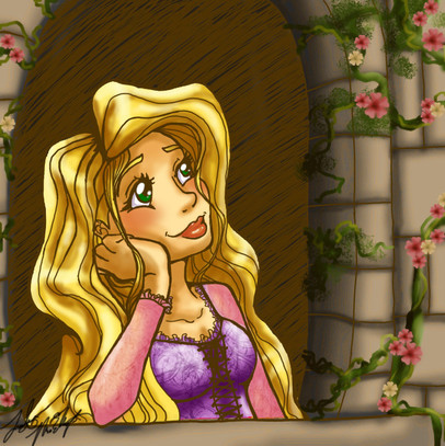 Rapunzel is bored. She just keeps waiting for her life to begin. She really should just take her own destiny by the hand and leave the tower, but I'm not going to get into that.Tried a different coloring style. Tell me what you think...