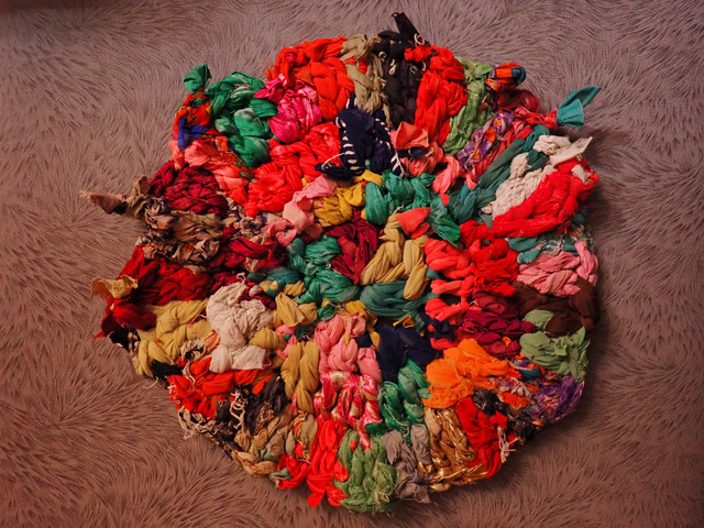 This is for an environmental trash project where we take things that usually fill up those land fills and make some functional and aesthetic. This here is my functional piece which I made by stripping colorful plastic bags into long pieces and then using my handy swedish loom to create it!There are about 30 different bags in this rug.
