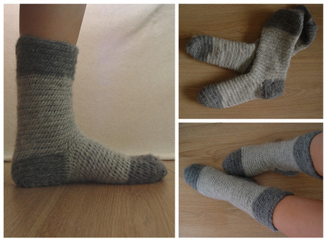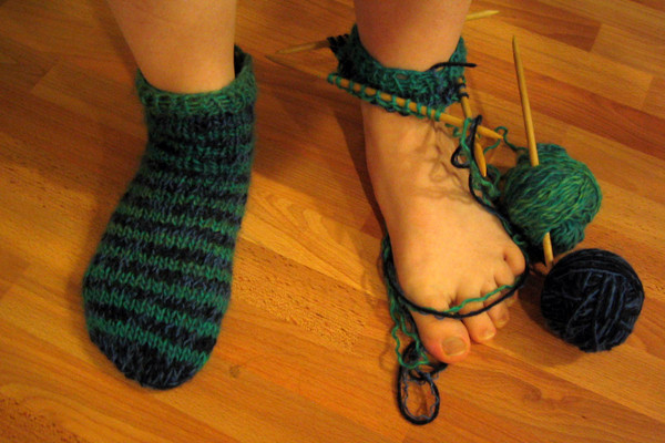 I made this after I ran in to trouble knitting my wool sock. This one is made from acrylic red heart yarn, cheap stuff for practice. Very warm, but the acrylic is sweaty. Be better in cotton or wool! They wont fit in shoes too well, but theyre great for birkenstock type sandals or big boots. Or just in bed!I used this pattern -