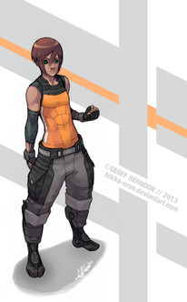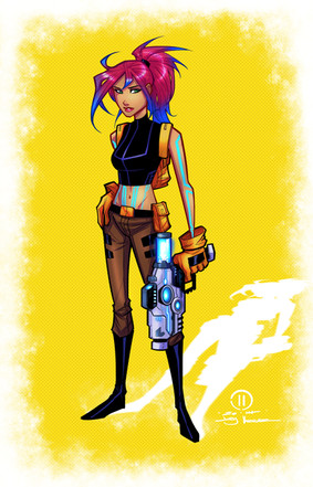 Ooooh thats gonna be an amazing comic!, I cant wait to read that, it sounds high octane and vibrant. I like the colours to be honst, as you know black and gold are one of my fav col combinations, the blue in it is great though, it adds a touch of serenity to the image, that kind of balances the... whats the word... edginess? I wanna say, hmm, anyway when I look at her I feel energy, this image is buzzing with it. which is crazy because of the calm stance and relazed colours. i like the title as well, also the way you did it. Her gear is awesome and I love the mask.