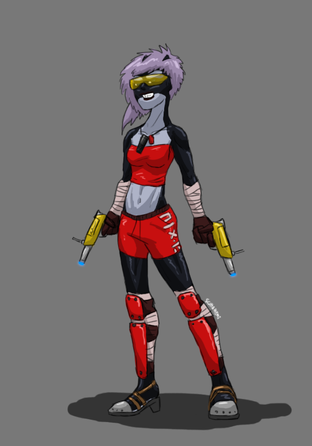 Most of you have already seen Drone and Droid. Who you haven't seen are the rest of the crew. The bombing bros. Borg and Bot. Tech, Mech, and Spark. This here is Sentry (Tech's older sis). Her story begins when she was in a train accident as a child, resulting in her loss of legs. She now has acquired cyber prosthetic legs that give her mobility along with enhanced speed, and agility. As you may guess this helps her out tremendously with late night tagging sprees