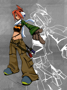Ok, so here she is colored up. (not too happy with the color job i laid down. I may go back and re color her later) Anyway, for those who dont know what G.R.A.F. is, allow me to tell youGraffiti Rebel Attack Force is a series that started out as a comic idea with my character Drone. Basically the story is about a crew of graff heads that have all been cyberneticaly modified with prosthetics and enhancements to their bodies. Rather than the boring old 'fight the power' scenrio. The basis of this story revolves around keeping graffiti alive in a dull, bleak and brainwashed society where graff has already been blacklisted.