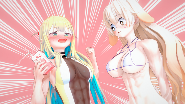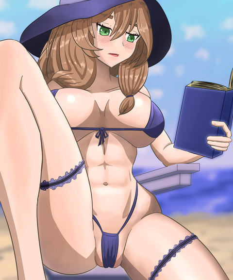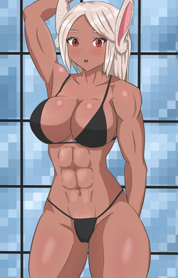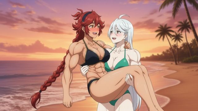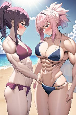 #beach #digitalart #animegirl #originalcharacter #abs #bigbreasts #bunnygirl #yuri #muscularfemale #darkskinnedgirl #gold_bikini