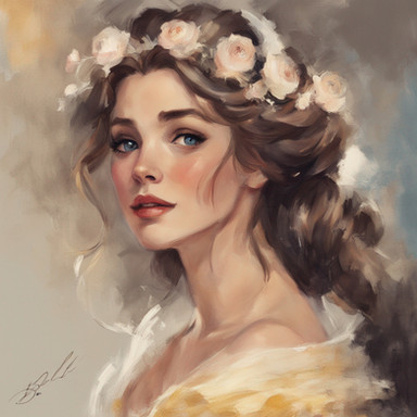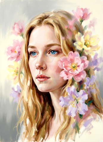 I've rarely seen such a beautiful woman, she's so perfect, I love how you painted her, how you did her hair, her face shapes, and especially the flowers and the little lights coming from it !