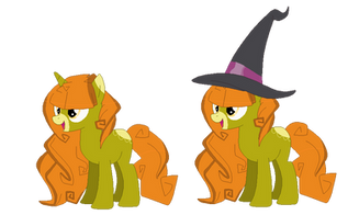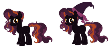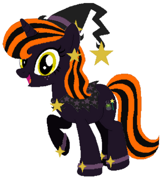 wow, she's adorable. Awesome mane with the black and orange stripes, and IU really like her witchy hat, cape and 'shoes'. I like the use of stars too. Overall, she's very adorable.