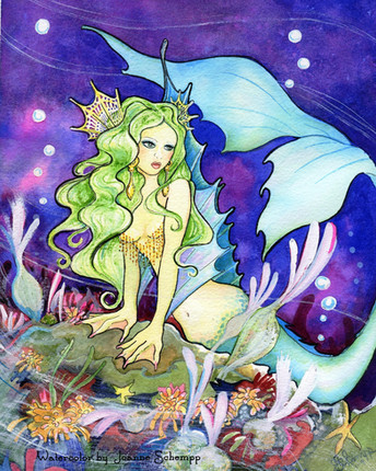 Beautiful! The colors are magnificent (I really like the white fins with all the blue and the color of the shells). The mermaid on a rock pose is classic but you seem to make it fresh and new everytime it's painted