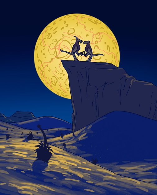 The lifecycle of the spinners of Tungsten Heart is one of death and rebirth. When two spinners mate, they exchange male seeds and fertilize each other. With no way to lay the seeds in the ground, the pair of spinners opts instead to find a high branch to perch on, often together. Here their metabolisms will slowly shut down and the parents will perish where they stand. Inside them, the now fertile seeds will rapidly develop into pupae; nearly microscopic spinners with tufts of fluff instead of wings. Once these pupae develop, their parents' bodies will begin to shrink around their filamentous skeletons and break open, and their young will fly into the breeze like dandelion seeds. Thousands of spinner pupae will be released into the wind, and a small handful of them will drift long enough to reach maturity, sprout their own wings, and restart the cycle.Be it knowingly or not, it is in a spinner's nature to die for their children.