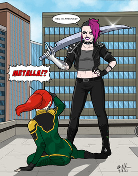 A follow up scene from the previous pic.In the last pic, Rai and Atomic Girl faced off for the first time, with Atomic Girl condemning Rai's brutal sense of justice, while Rai was having none of Atomic Girl's childish sanctimony. Seeing that words were not gonna settle this dispute, conflict between the two hot-tempered heroes was inevitable, resulting in the intense fight scene you see above.